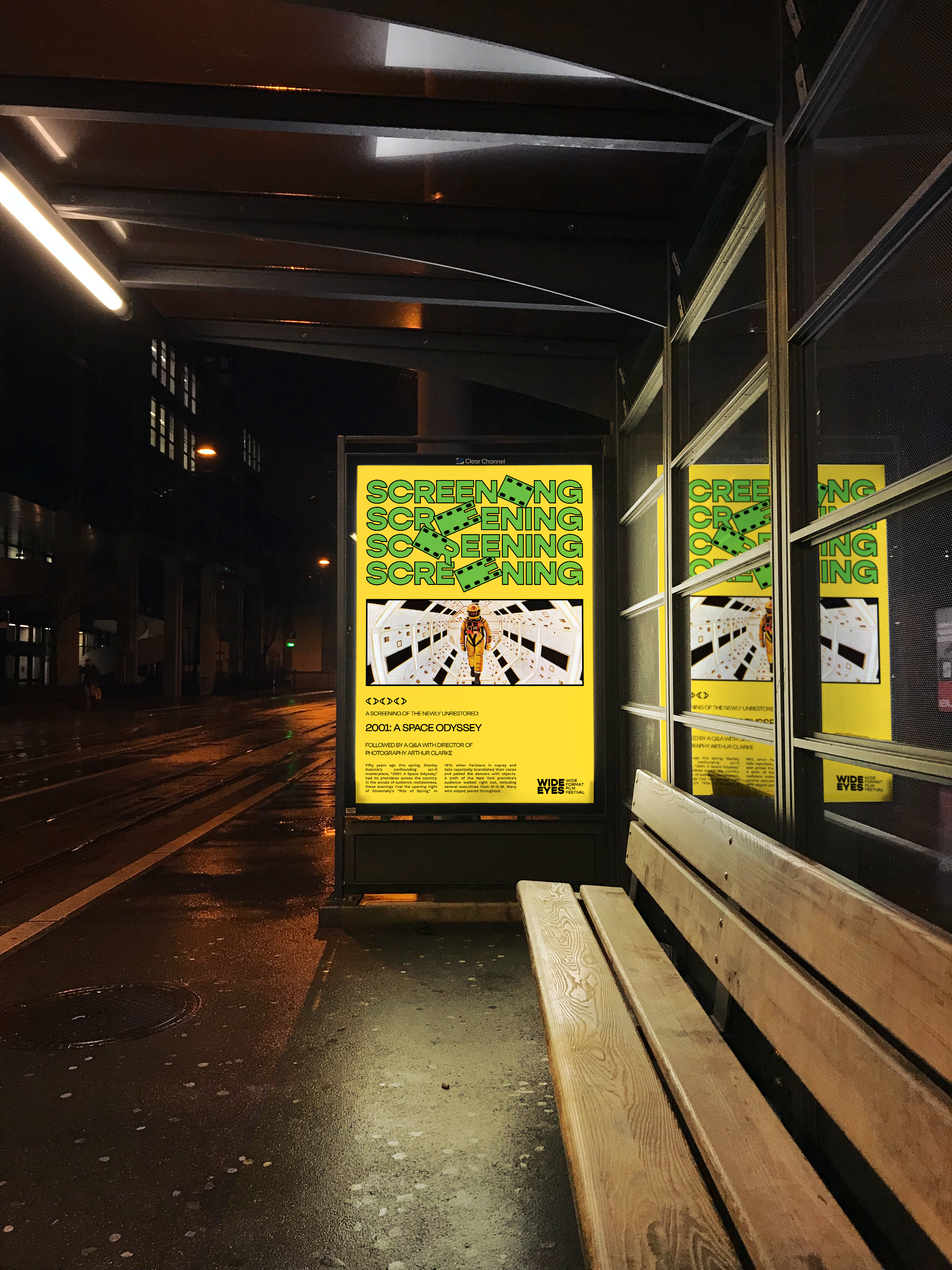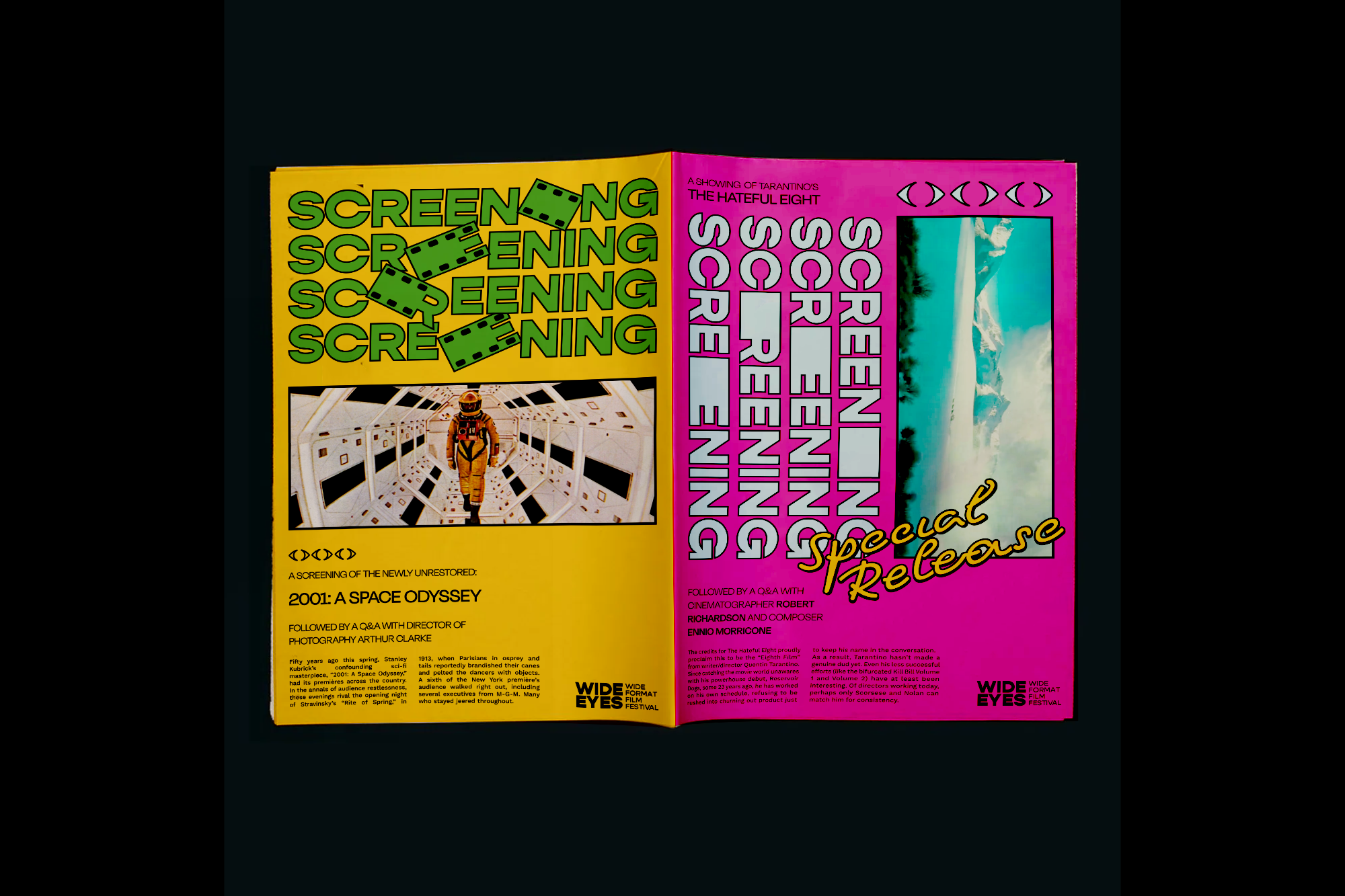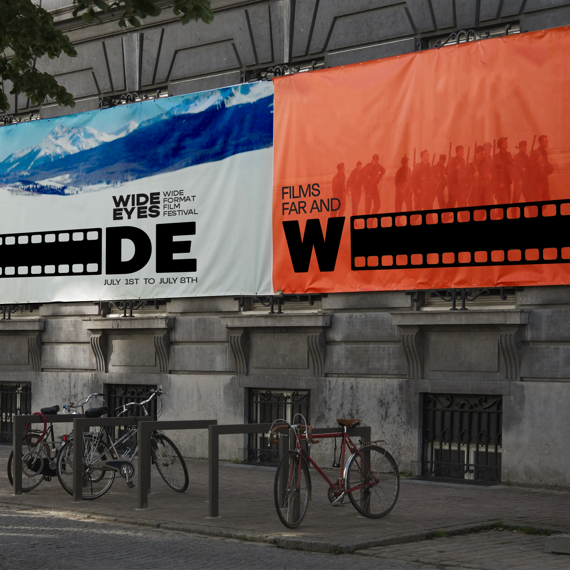 The Wide Eyes Film Festival is an imaginative tribute to the art of wide-format filmmaking. The festival's brand identity and logo are meticulously crafted to embody reflexive frames, dynamically responding to the unique contexts and containers they inhabit. This thoughtful design approach not only encapsulates the essence of the festival but also echoes the very essence of wide-format cinema, creating a harmonious synergy between form and content.