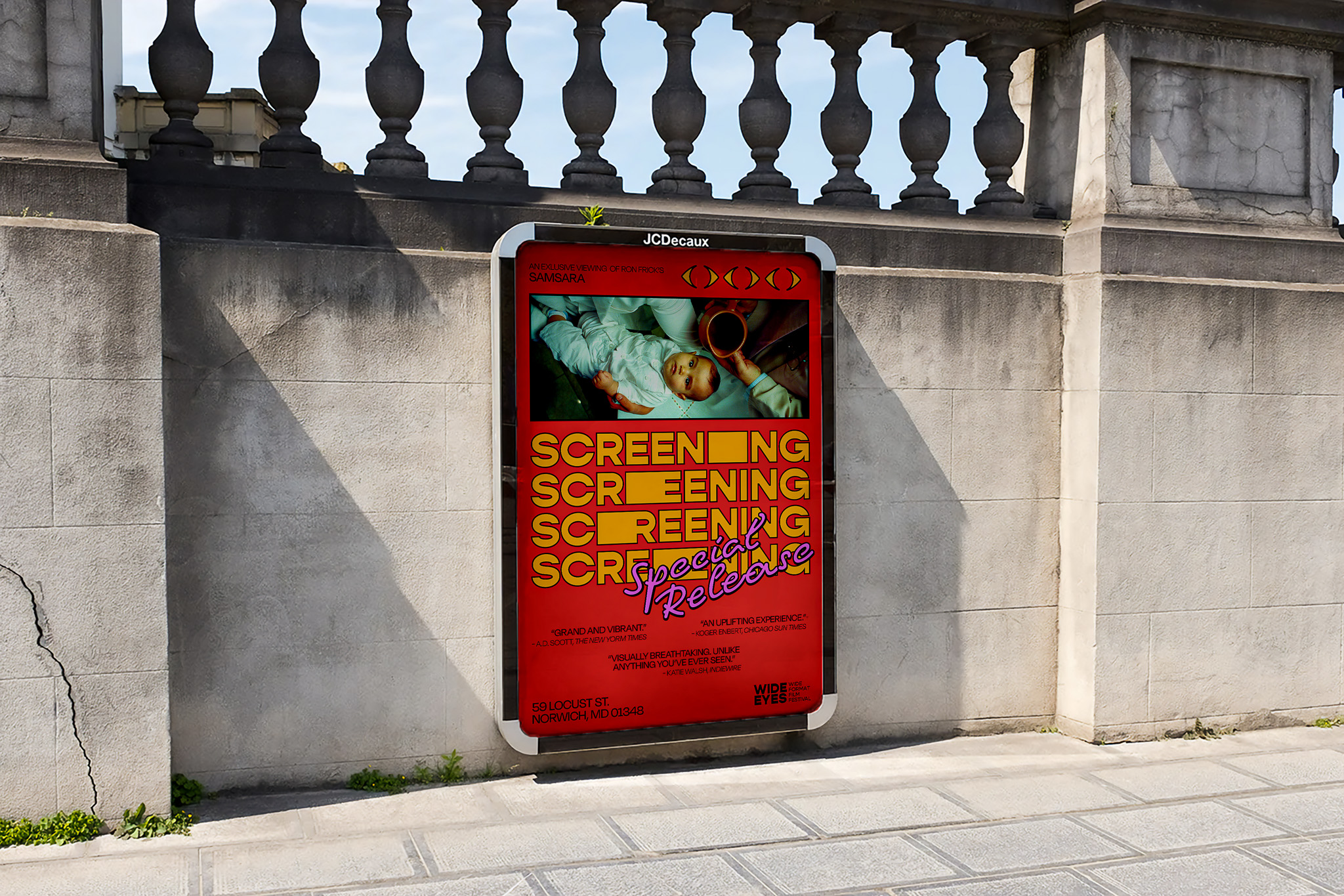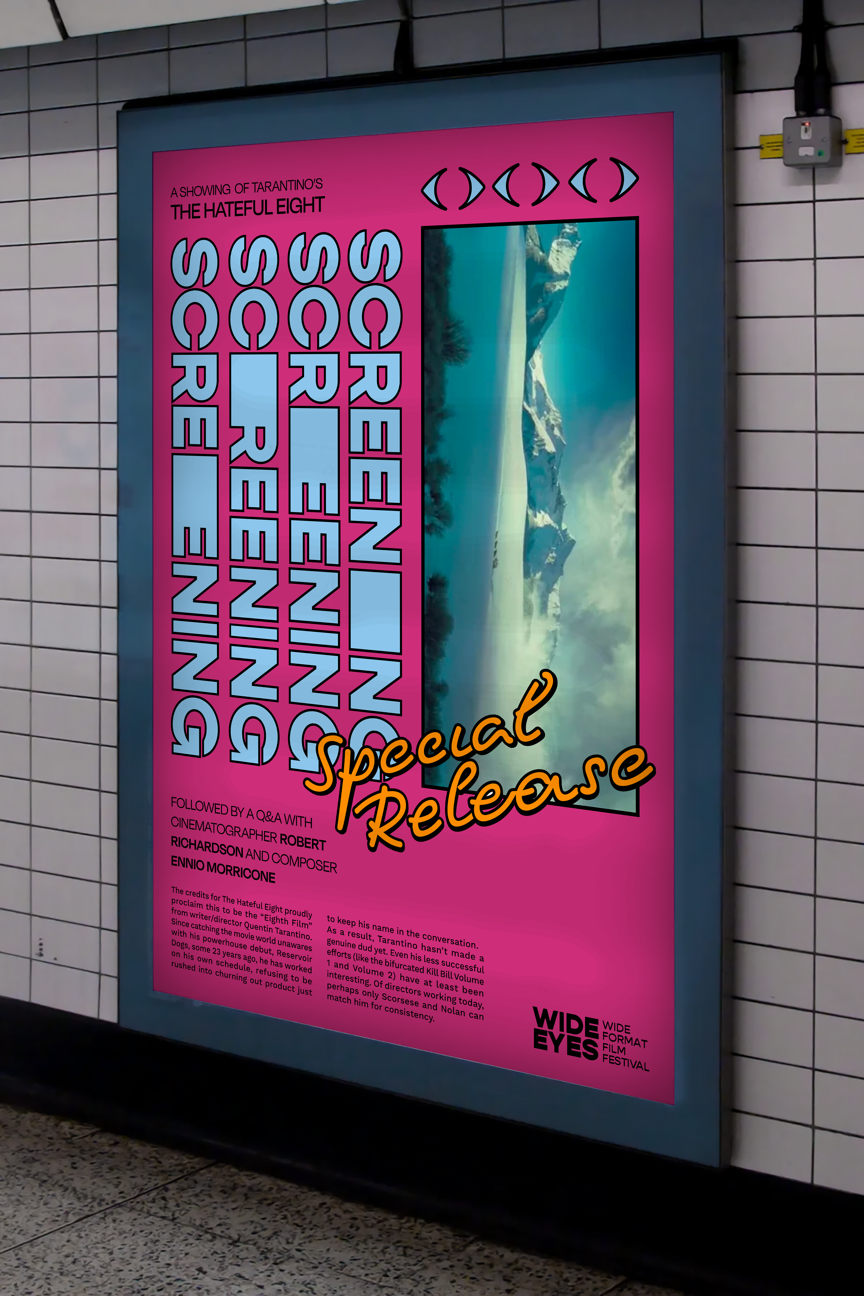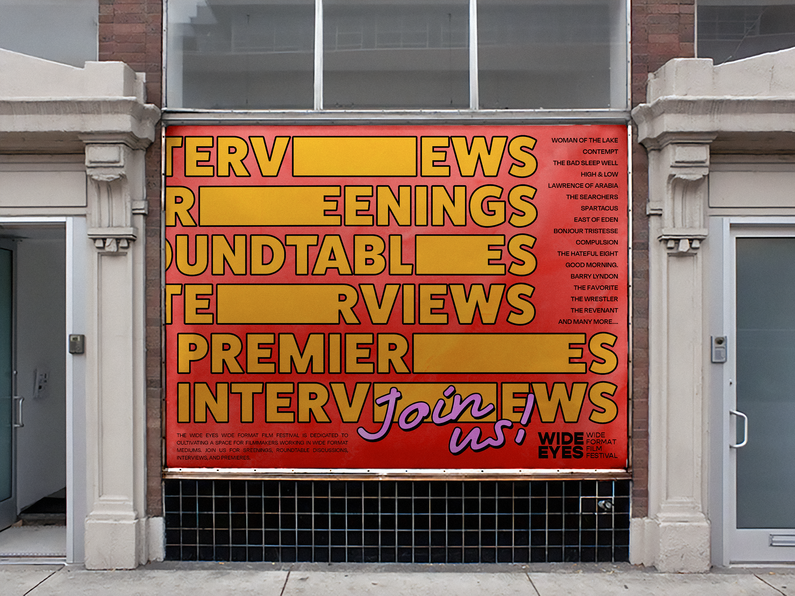 The Wide Eyes Film Festival is an imaginative tribute to the art of wide-format filmmaking. The festival's brand identity and logo are meticulously crafted to embody reflexive frames, dynamically responding to the unique contexts and containers they inhabit. This thoughtful design approach not only encapsulates the essence of the festival but also echoes the very essence of wide-format cinema, creating a harmonious synergy between form and content.